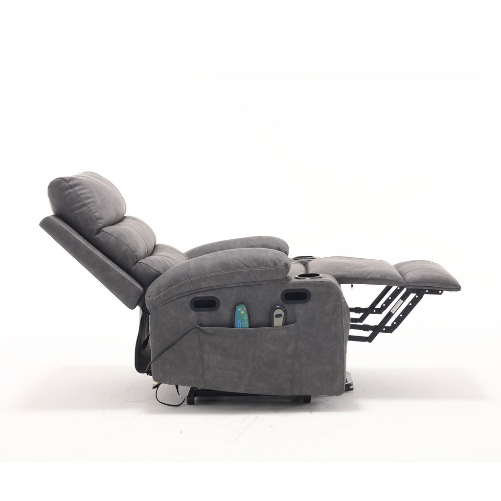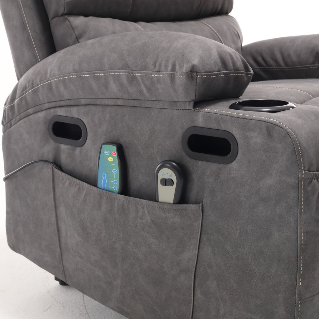 This recliner also includes side pockets for easy storage, cup holders for added convenience, and a remote control for effortless operation.