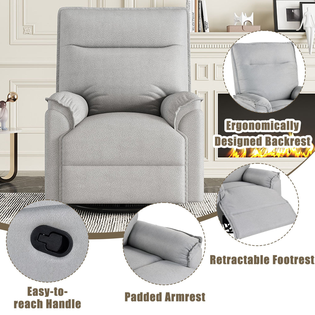 Rocking & 360° Swivel Functionality: This nursery recliner features 360-degree swiveling and a rocking motion, along with an adjustable recline from 90° to 160°. Perfect for breastfeeding or relaxing, it combines versatility with comfort for daily use.