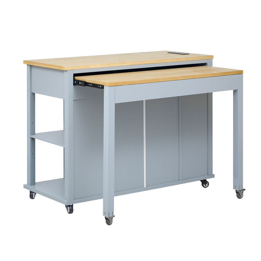 The food prep island cabinet measures 47.2" x 19.6", while the extendable meal prep and dining table features 2 lockable wheels and full-extension rail for easy mobility and stability. With dimensions of 13.7"x41.7".