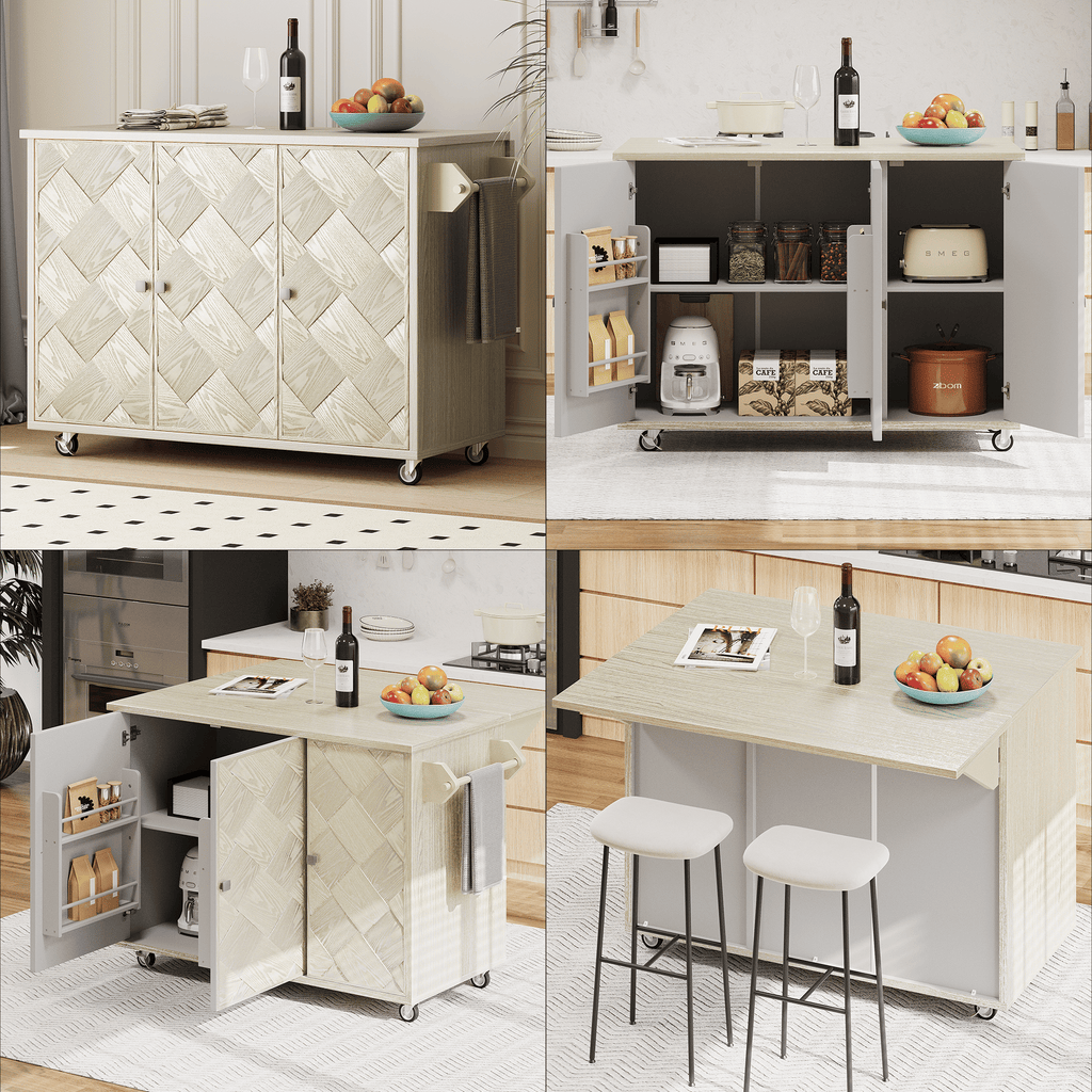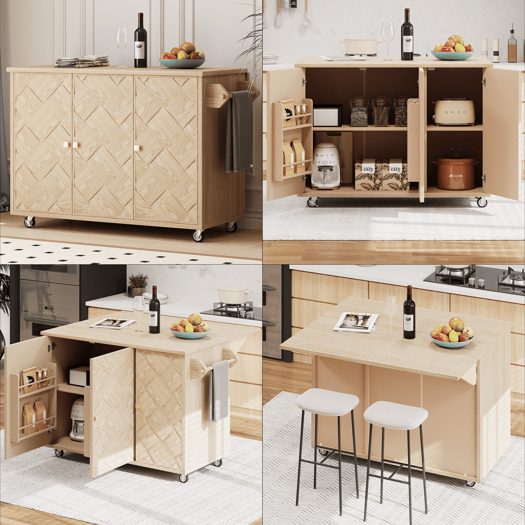 This modern coastal style indoor kitchen island dining cart can bring class and elegance to your kitchen space while bringing a great degree of convenience to your indoor storage. It is mainly made of eco-friendly MDF material that will stand the test of time for a long time. The overall wood grain look coupled with the ASH veneer handwoven construction will give your kitchen a more upscale look. In terms of storage space, this kitchen cart has a large 46.5"-wide countertop with drop leaf design, a side towel rack, two internal storage racks and adjustable shelves, so you can freely arrange different items as needed. There are four wheels on the bottom of the product, two of which are lockable and able to move and stop freely. If you need stability, you can also replace the wheels with the included wooden feet. This kitchen island can make you no longer worry about storage in your kitchen space.