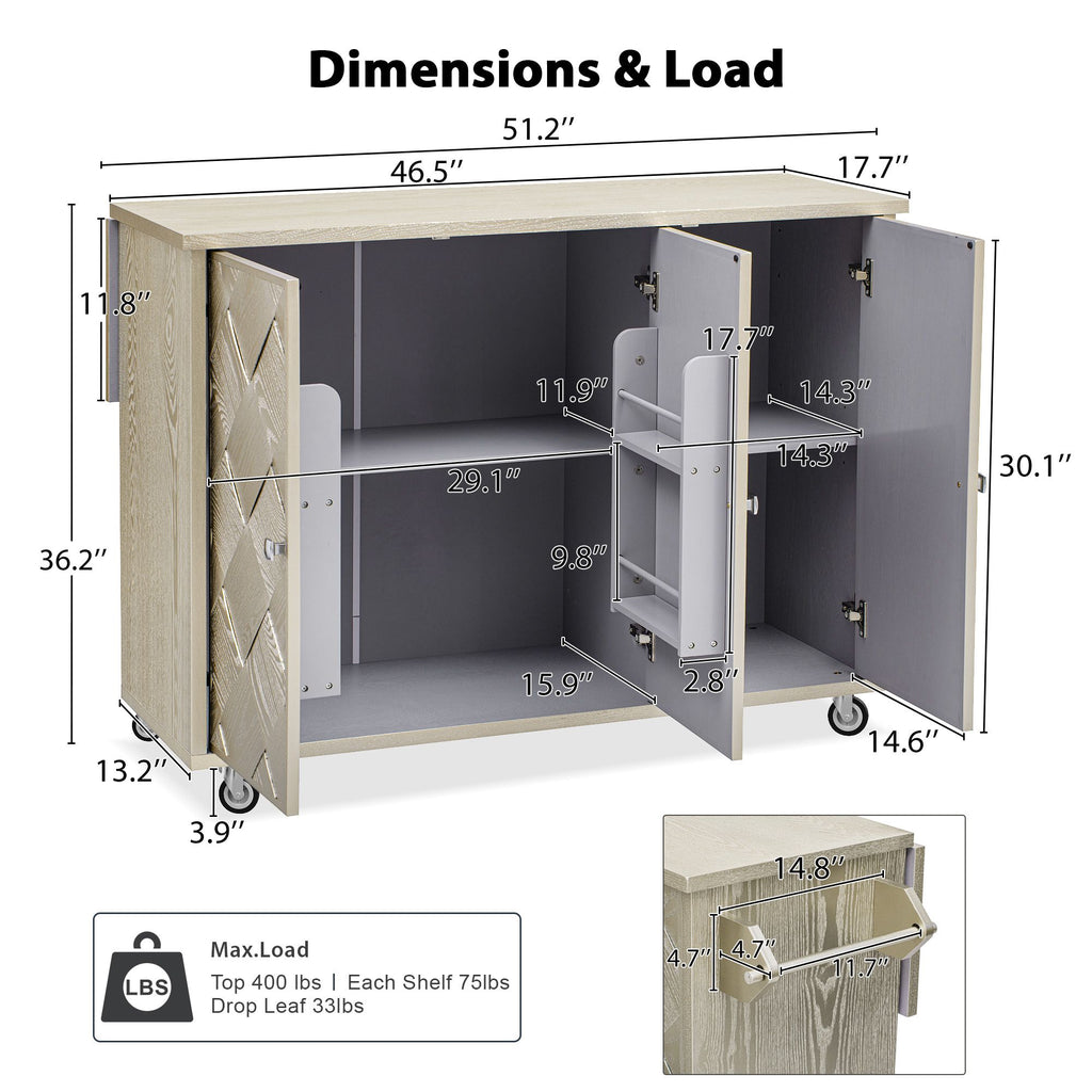 [Drop Leaf Design] The portable 46.5" D island features a drop leaf countertop, crafted from 0.98-inch thick premium MDF+ASH veneer, serving as an intelligent and efficient solution for compact kitchens or dining areas. The inclusion of the drop leaf table allows for effortless folding when not in use, thereby optimizing the utilization of available space.