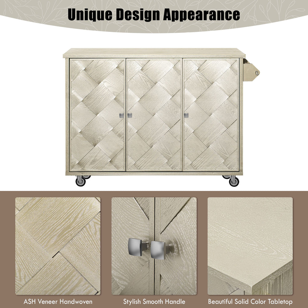 [Ash Veneer Handwoven Doors] Our modern coastal-style kitchen island retains the beauty of excellent natural aesthetic design and woven textures. The unique color appearance and wood grain texture of the ASH veneer door paired with a handwoven design. One will not be able to help but marvel at its unique take on aesthetics. The surface of the kitchen cart is painted in a very smooth and detailed finish that will stand the test of prolonged use and bring a longer lasting appeal to your kitchen.