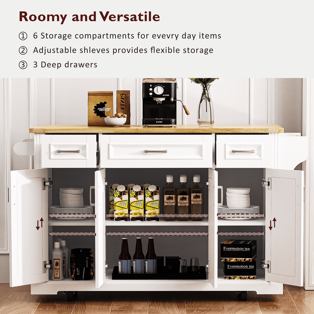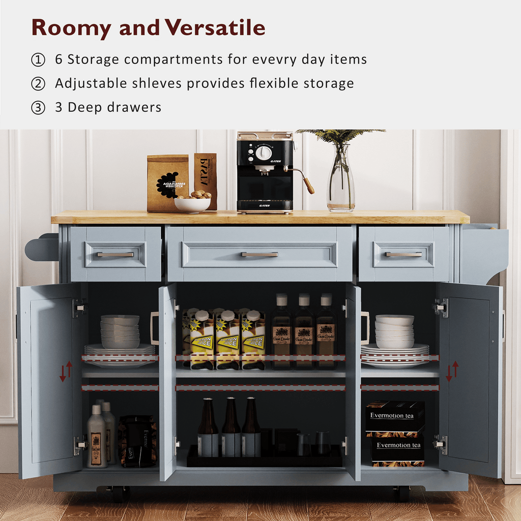 [Large Storage Space] The storage kitchen island offers a variety of storage options to maintain a clutter-free space: the 47" wide rubber wood top provides easy access for frequently used items and ample workspace. The three drawers offer additional storage for smaller items such as napkins, coasters, or wine accessories. The four doors open to reveal adjustable shelves, allowing for customizable interior storage based on individual needs.