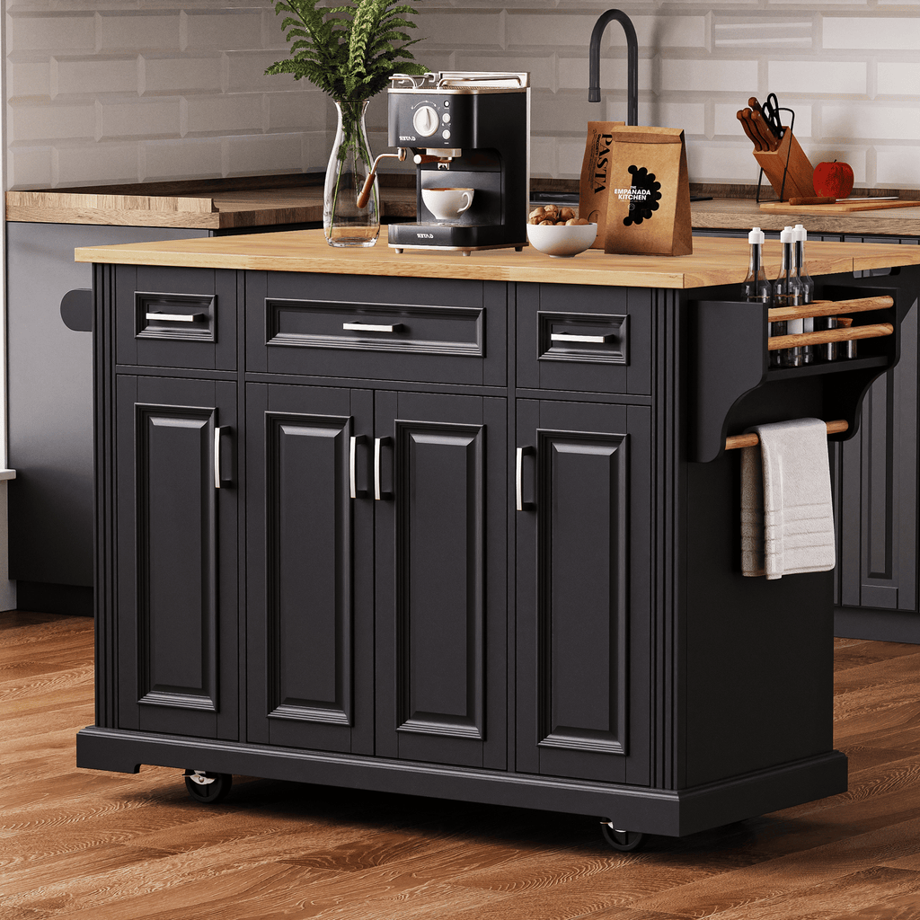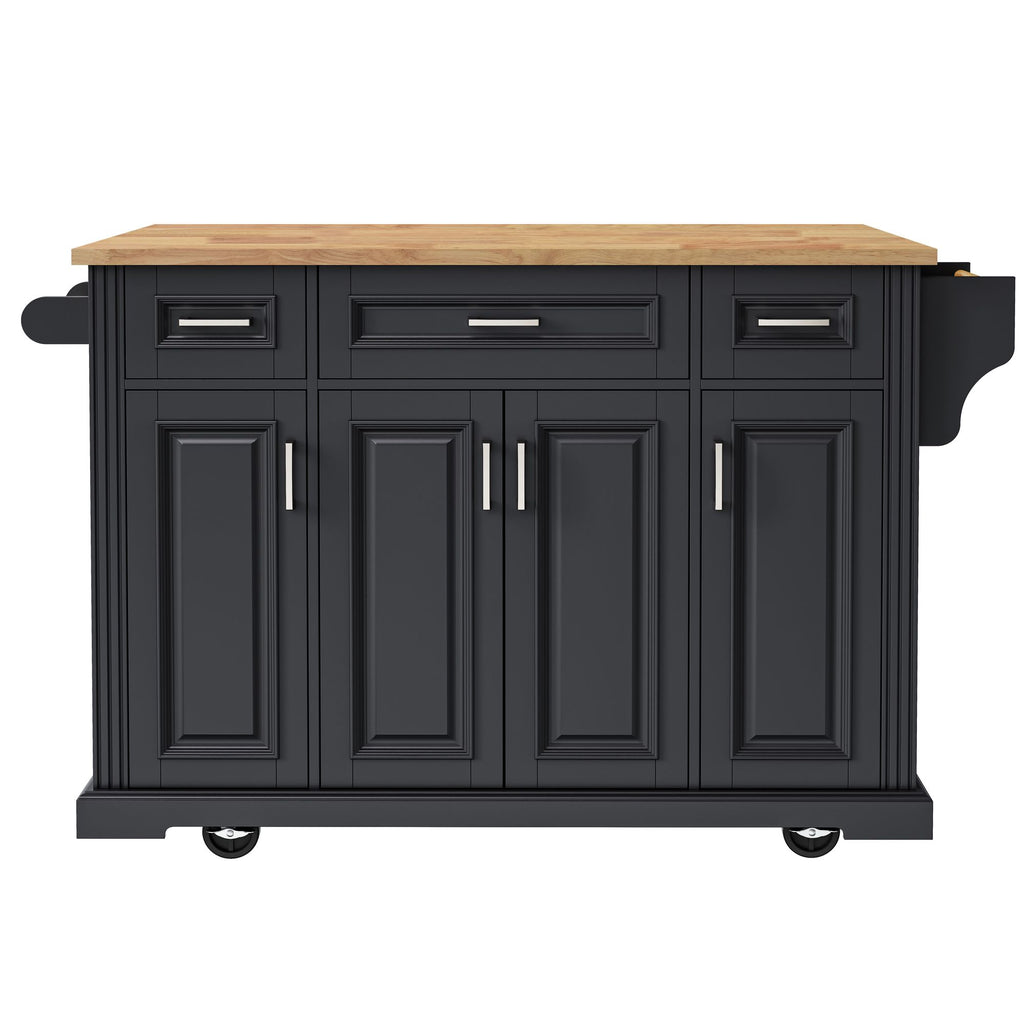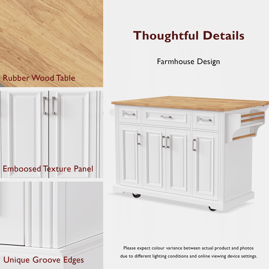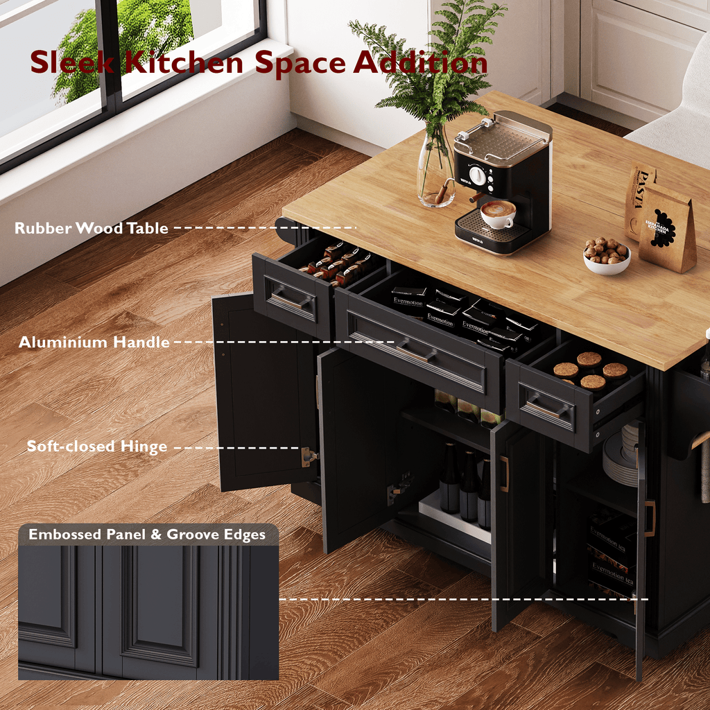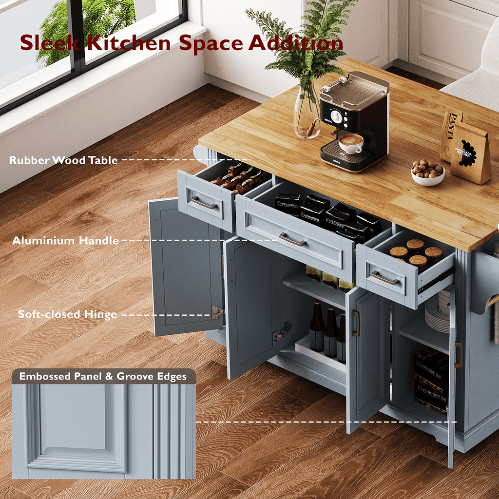 Introducing our 54-inch wide, beautifully and elegantly designed kitchen island, a perfect fusion of clean lines edges, and embossed texture panel that bring a touch of rustic charm to your home. With its spacious design and durable construction, this island is not just a statement piece but also a practical addition to any dining room, or kitchen area. Crafted from a rubber wood table and high-quality MDF, it offers ample storage(drawers and cabinets) for your kitchen essentials while blending seamlessly with various interior styles, from farmhouse to modern.