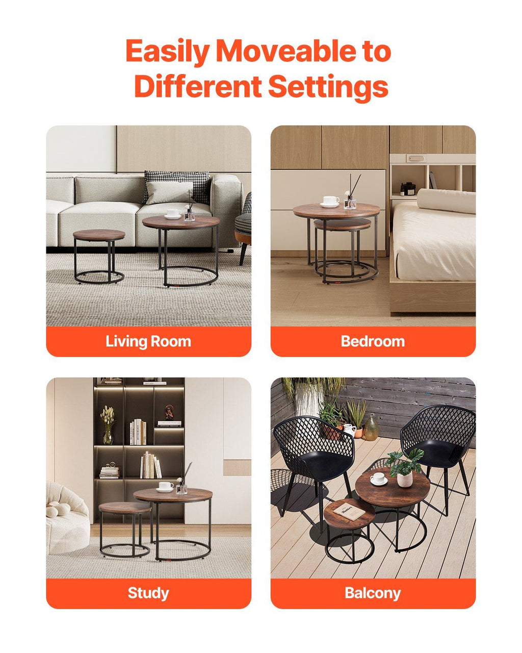 Stable and Durable: Our round nesting coffee table has a sturdy carbon steel frame, which can withstand everyday pressures and maintain its integrity over time. The adjustable foot pads let you quickly deal with uneven floors, ensuring the table stays stable and wobble-free