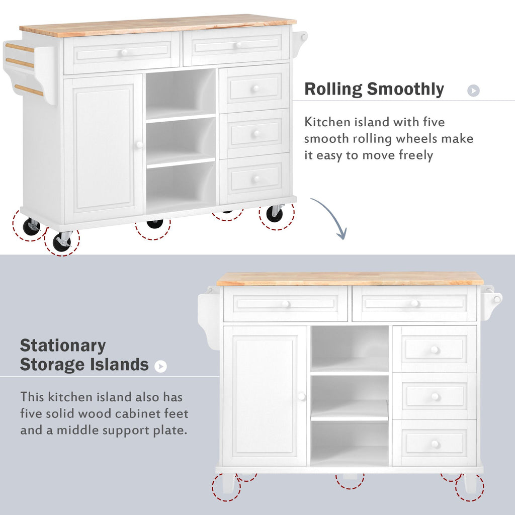 Kitchen Cart with StorageThis wallet-sparing and space saving island features many of the bells and whistles that kitchen cooks want and need. The island also comes with 5 easy-glide drawers, towel holder and spice rack, concealed storage cabinet with a door design, providing ample storage for all kinds of kitchen utensils and supplies