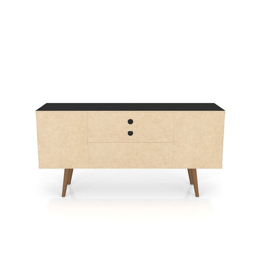 Introducing the Manhattan Comfort Liberty 53.14" Mid-Century Modern TV Stand in sleek black, a statement piece that seamlessly blends style and functionality. This TV stand exudes a timeless mid-century modern charm with its clean lines and minimalist design, making it a perfect addition to any contemporary living space. Featuring five open shelves and one concealed door, it offers ample storage for media essentials, gaming consoles, and decorative items, keeping your space organized and clutter-free. The sturdy construction ensures durability, while the black finish adds a touch of sophistication to your home decor. Upgrade your entertainment area with this versatile TV stand, designed to enhance both your visual and storage needs in a modern and elegant way.