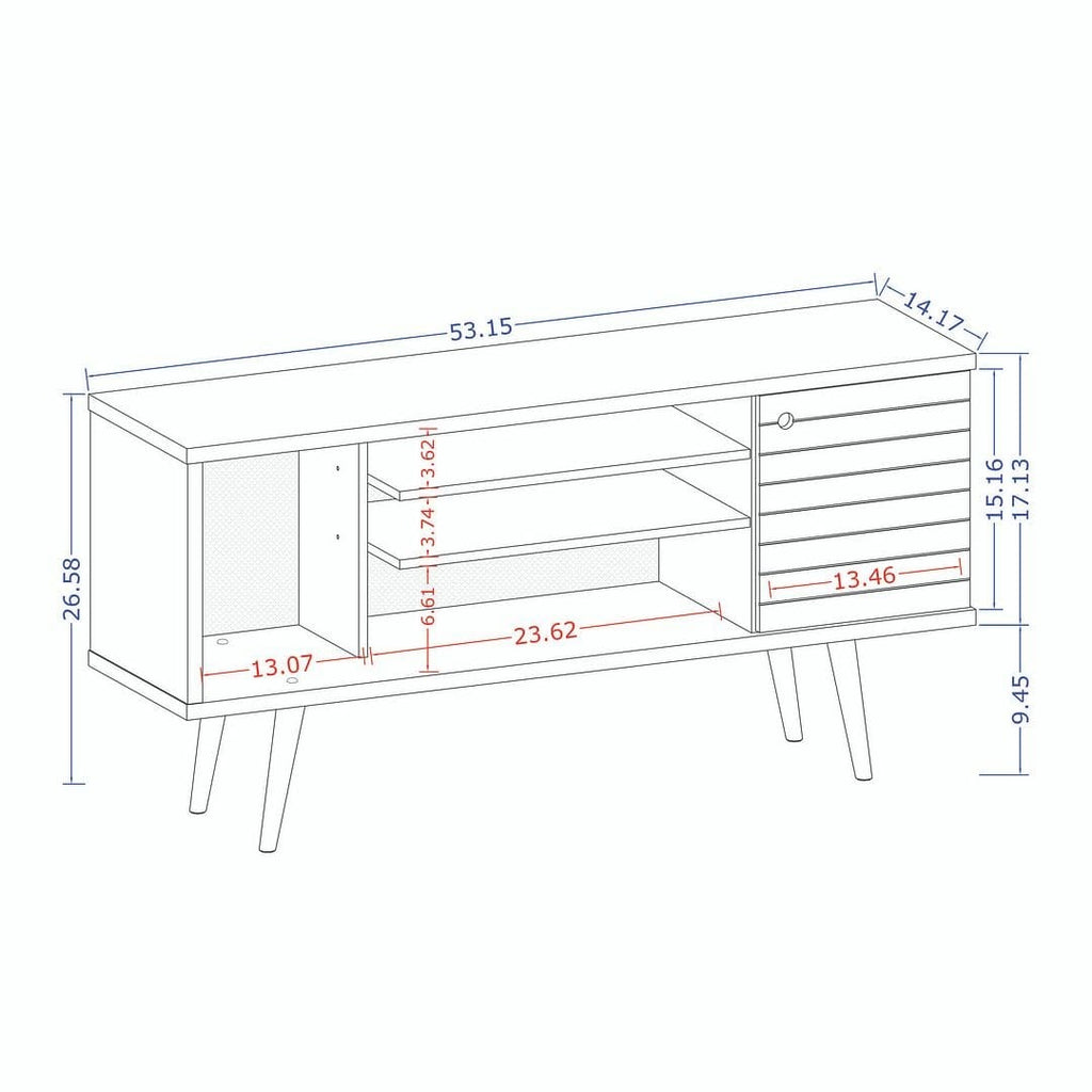 The Liberty 53.14 Mid-Century Modern TV Stand is the perfect blend of quality craftsmanship; brilliant design; and purposeful functionality. Featuring a large open compartment; one hidden cubby; and three center shelves to create the ultimate entertainment center perfect for stashing DVDs; board games; electronics; and media accessories. Free standing and easy to maneuver; this piece will mix well with any decor and its artful grooves will create a statement in any space.