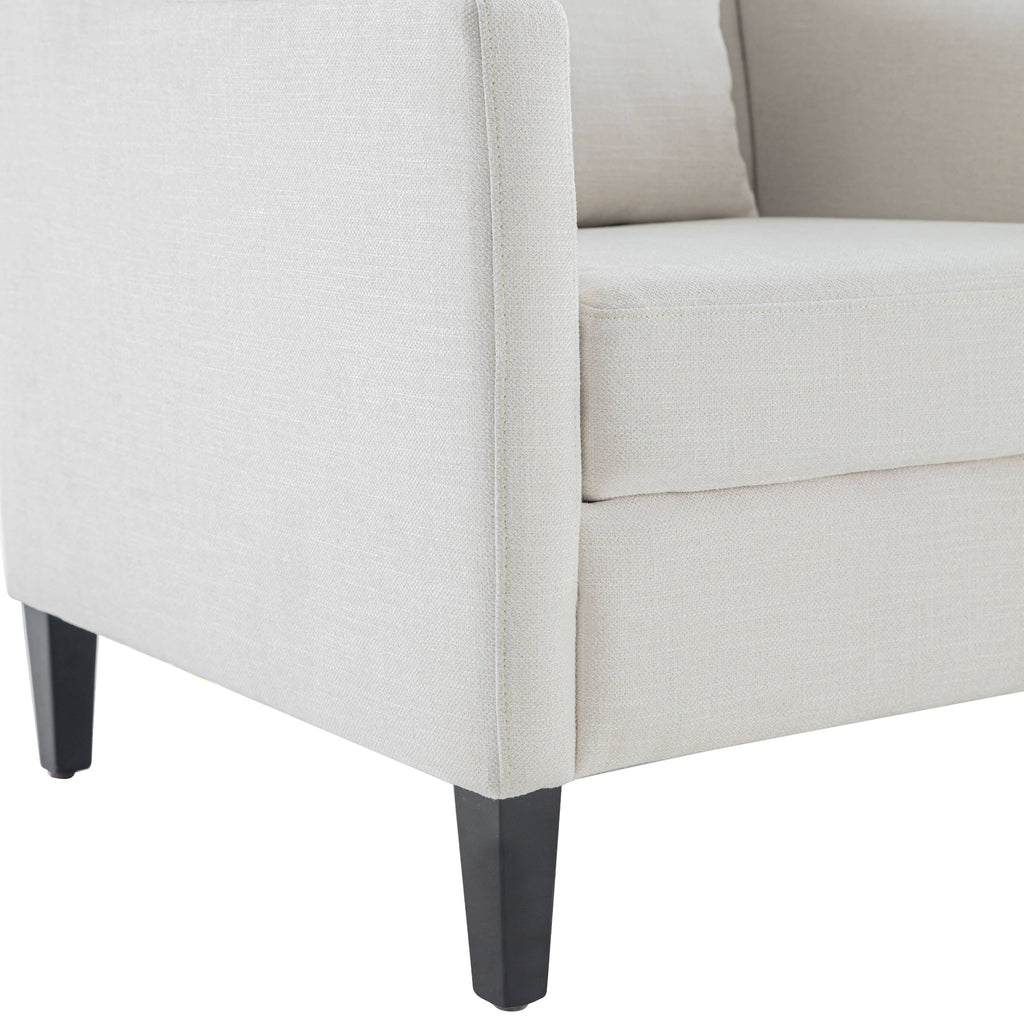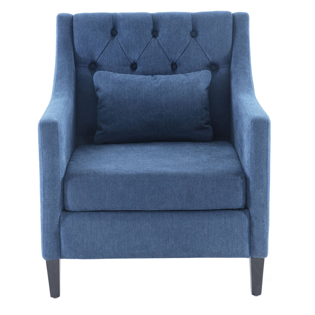 Stylish mid-century chair with lumbar pillow. Sturdy birch frame (300-400lb capacity). Plush polyester upholstery. 28.5"W compact size. Easy assembly. Teal/Beige/Blue.