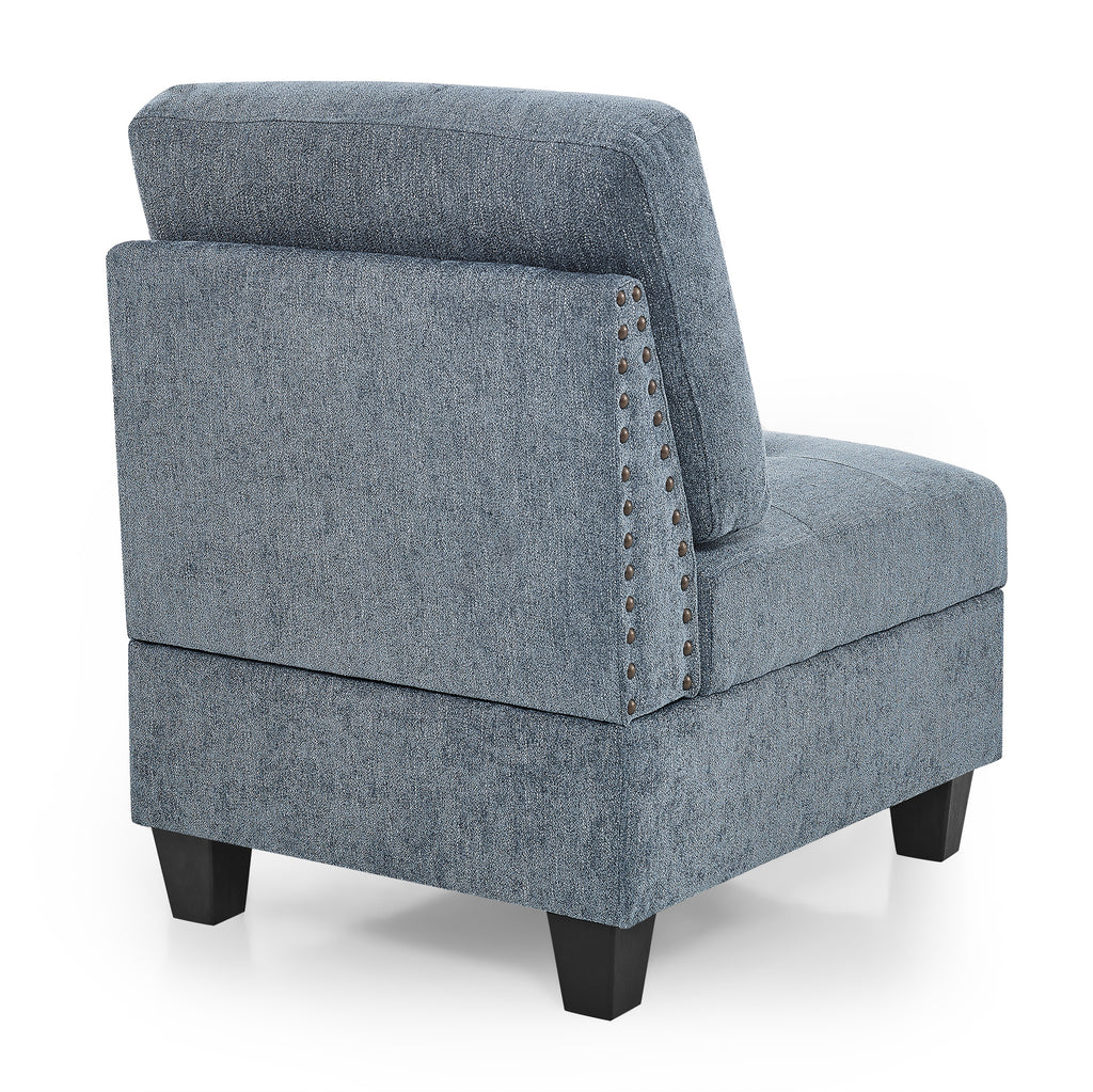 Introducing our Single Chair for Modular Sectional in a rich navy hue, measuring at 26.5 inches in width, 31.5 inches in depth, and 36 inches in height. This carefully crafted chair not only embodies sleek design but also promises exceptional comfort and versatility. Upholstered in a deep navy fabric, it effortlessly adds a touch of sophistication to any room. Its modular design allows for seamless integration into various configurations, ensuring adaptability to your evolving needs. Sink into the plush cushioning and indulge in relaxation, whether used independently as a stylish accent piece or combined with other modular units to create a customized seating arrangement. Experience the perfect blend of aesthetics and functionality with this navy Single Chair for Modular Sectional, enhancing both the look and comfort of your living space.