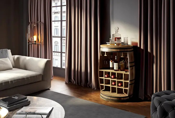 Decorate your home with this charming bar cabinet that features a wine barrel design.