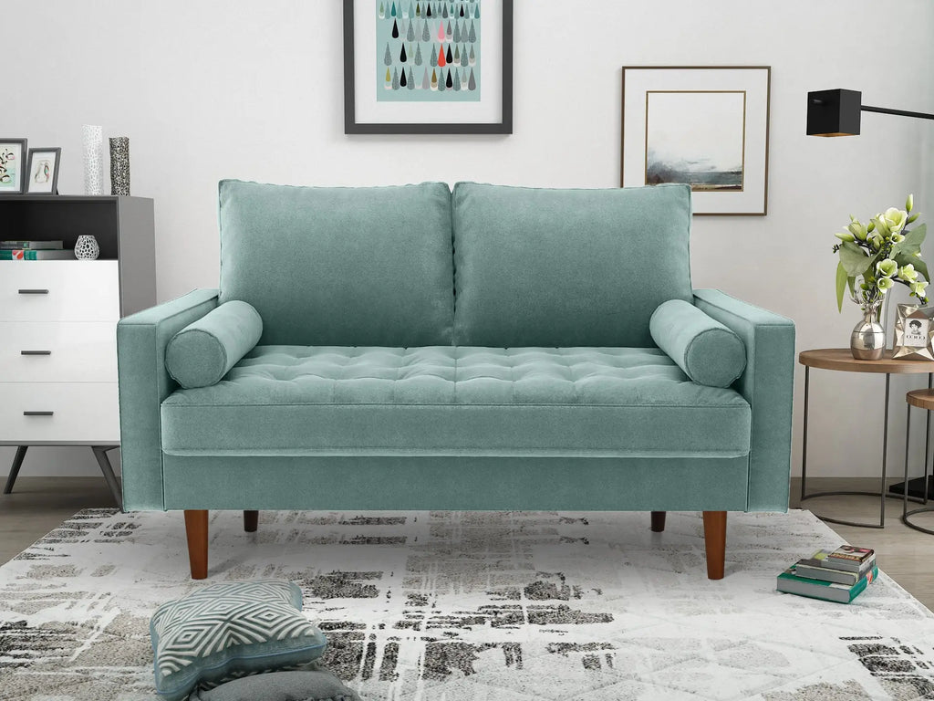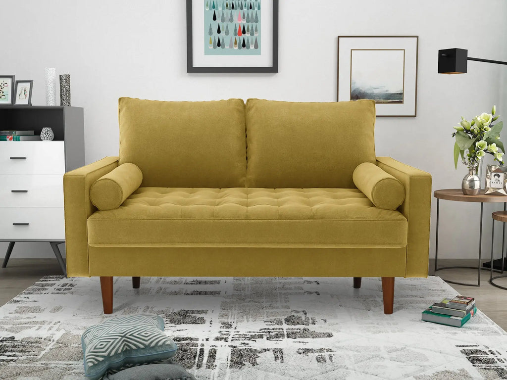 A classic mid-century style with a modern twist loveseat is the new norm. It has a wooden frame with durable tapered wooden legs. Add on to that is the soft-touch velvet upholstery decorated with button-tufted single cushion seat. It also comes with 2 bolster pillows. This loveseat will definitely add a refined touch to your home or office.
