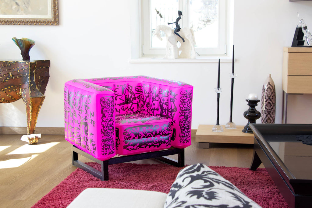 Very trendy and ultra-contemporary Urban Graffiti spirit. Yomi NEP luminous pink armchair, series limited to 35 pieces.